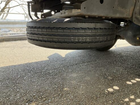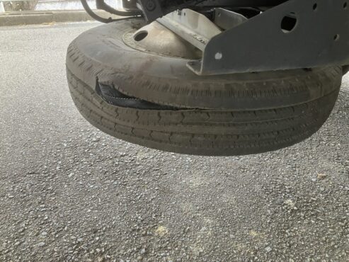 駐車している積載車の方からボォン、プシューーと聞こえたので、タイヤを確認したのですがパンクしているようでもなかったのですが、後日、偶然スペアタイヤを見ることがあり、バーストしているのを発見しました。